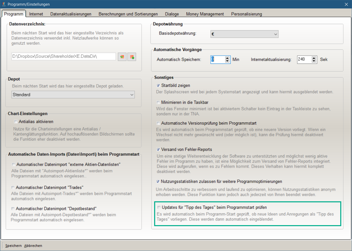 Sie können unter den Programm-Einstellungen die automatische Prüfung deaktivieren unter Programmeinstellungen / Programm / Sonstiges.