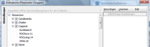 Indikatoren besitzen individuelle Parameter. Im Normalfall richten Sie die Einstellungen hierfür nach den betrachteten Zeithorizont. Um diese Betrachtungsweise zu unterstützen sind Indikatorengruppen eingerichet. Neben den individuelle Einstellungsmöglichkeiten können hier auch einzelne Indikatoren deaktiviert werden.