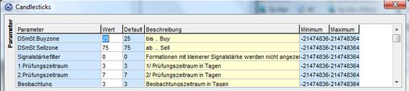 Editiergrid für alle vorhandenen Parameter eines Indikatores. Änderungen an den Parametern werden mit dem Button Speichern dauerhaft gespeichert und mit Abbrechen verworfen. Für jden Parameter gibt es einen Defaultwert der mit dem Button Reset aktiviert werden kann. Für die möglichen Werte eines Parameters gibt es zudem eine Range die durch die Minimum und Maximumwerte festgelegt sind.