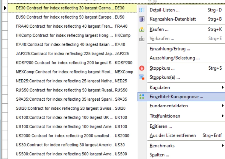 Dargestellt unter dem Reiter "Watchlisten" sind neben der Watchlisten-Funktion auch die Abfrage der Prognosewerte